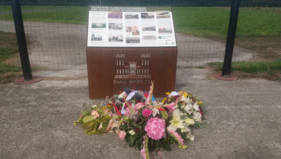 Wandelaars en fietsers die het Grimbergse vliegveld bezoeken krijgen op een informatiebord een beknopt overzicht van de geschiedenis van het vliegveld. Het infobord rust op een plaat in Cortenstaal waarin een gedenkplaat voor het Amerikaanse Camp White Tie (WOII) is verwerkt.